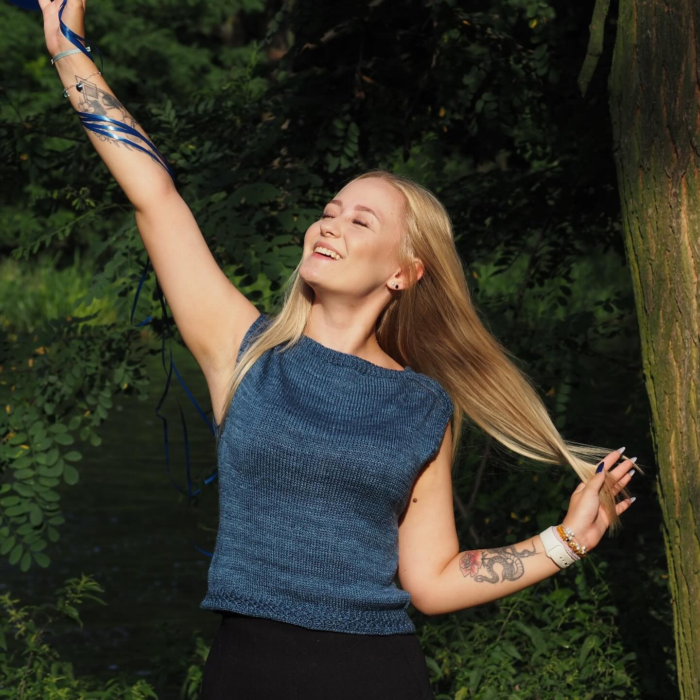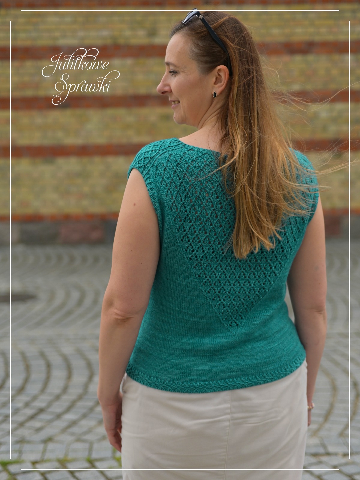 "Oblubienica" to niezwykle sensualna bluzeczka z ozdobnymi pagonami i ściągaczem. Posiada ażurowy motyw trójkąta na plecach, który optycznie wyszczupla talię i nadaje dzianinie lekkości i przewiewu. Przód bluzeczki, wykonany splotem dżersejowym, sprawia, że możesz czuć się w niej swobodnie i pewnie. Projektując tę bluzeczkę na drutach, zależało mi na tym, by była ona prosta w budowie, a jednocześnie kreatywna pod względem splotów, a osoba nosząca ją czuła się komfortowo i pięknie.