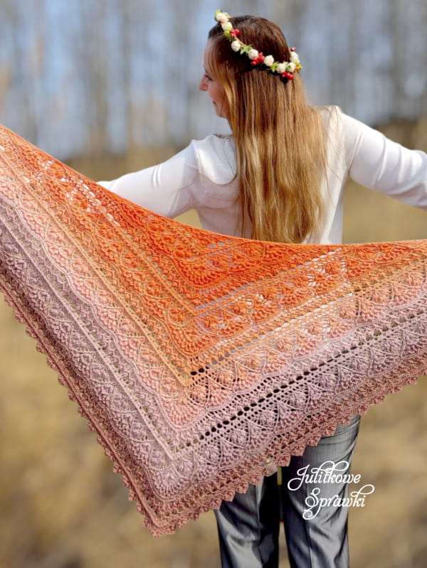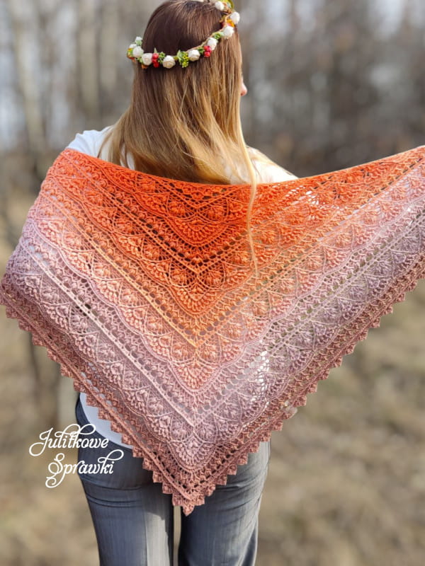 Powstała z myślą o wiośnie i budzącej się do życia przyrodzie. We wzorze na chustę znajdziesz przepiękne motywy kwiatów i spędzisz miło czas przy jej szydełkowaniu. Chusta jest niezwykle elegancka, zmysłowa i kobieca. Całość chusty wieńczy przepiękne zakończenie. Posiada idealny kształt trójkąta równoramiennego, dzięki czemu chusta idealnie się układa na ramionach, pod szyją czy na plecach.